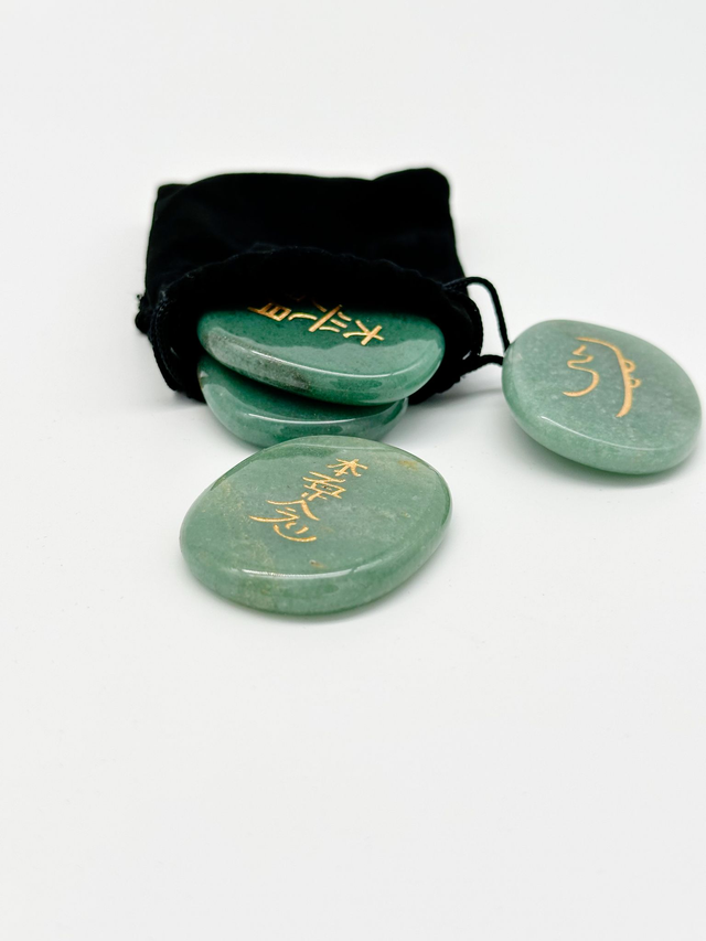 Reiki Steine Set – Grüner Aventurin mit Symbolen (4-teilig, im Beutel)